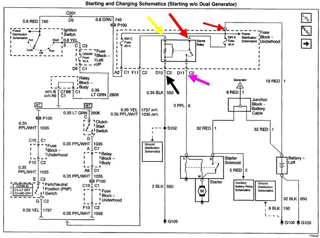 Next, everything up to the yellow arrow has to be okay. That's the main part of the circuit that powers the relay's coil. Since the relay is switching on, the neutral safety switch and its circuit are working. This is where you'd see 12 volts when the helper turns the ignition switch to "crank". The ground circuit, (black arrow), has to be okay too. We know that because the relay is switching on.
