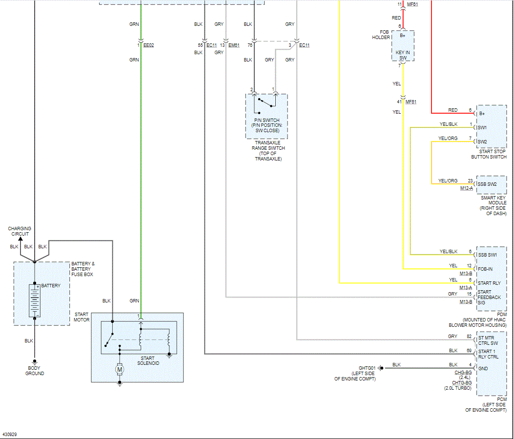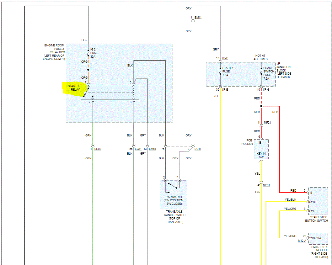 If you look below, I attached the wiring schematic for the starting system (smart key/push button). I highlighted the relay I'm referring to. It won't be a fuse or anything like that because it would never work if it was blown.