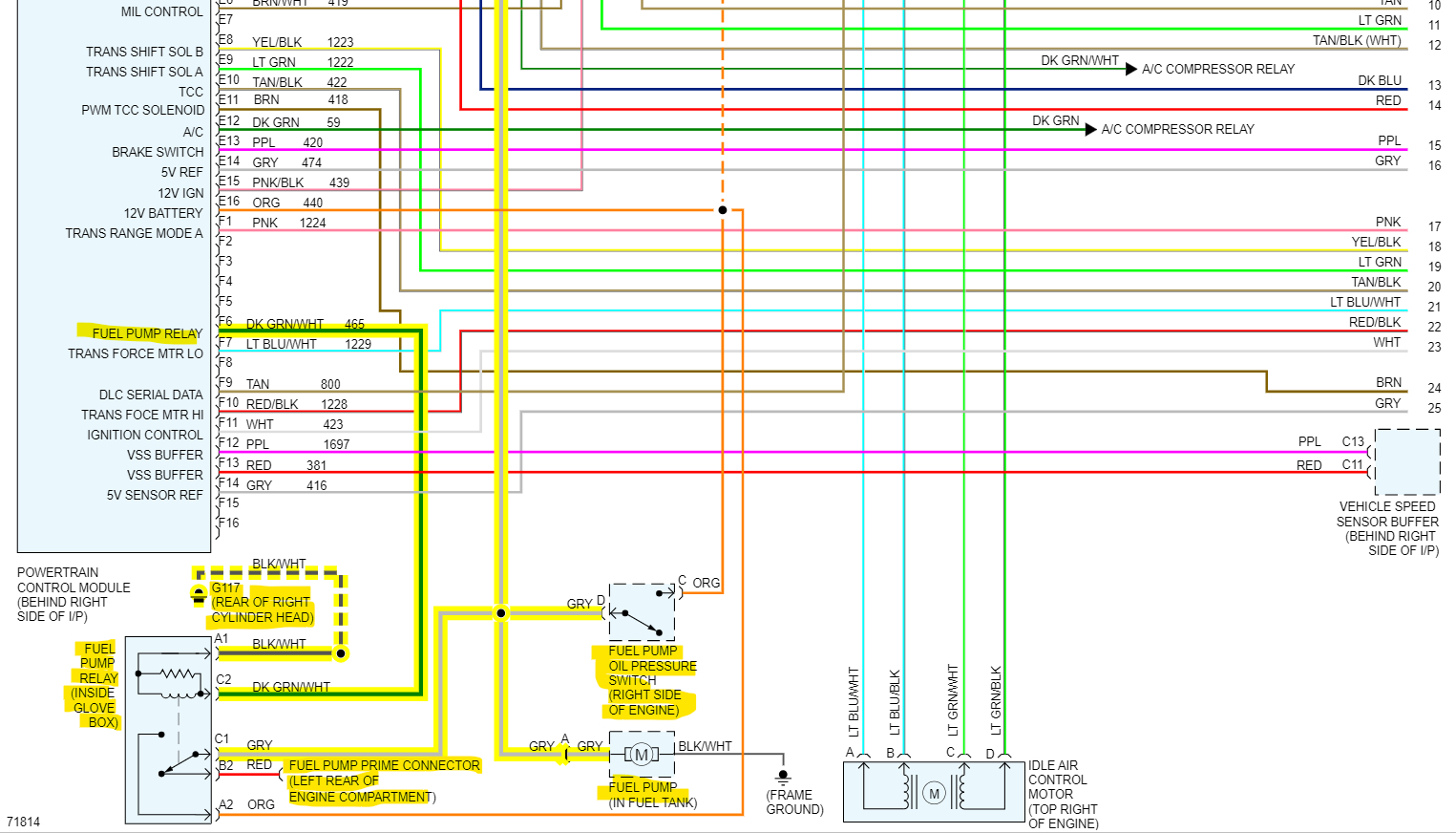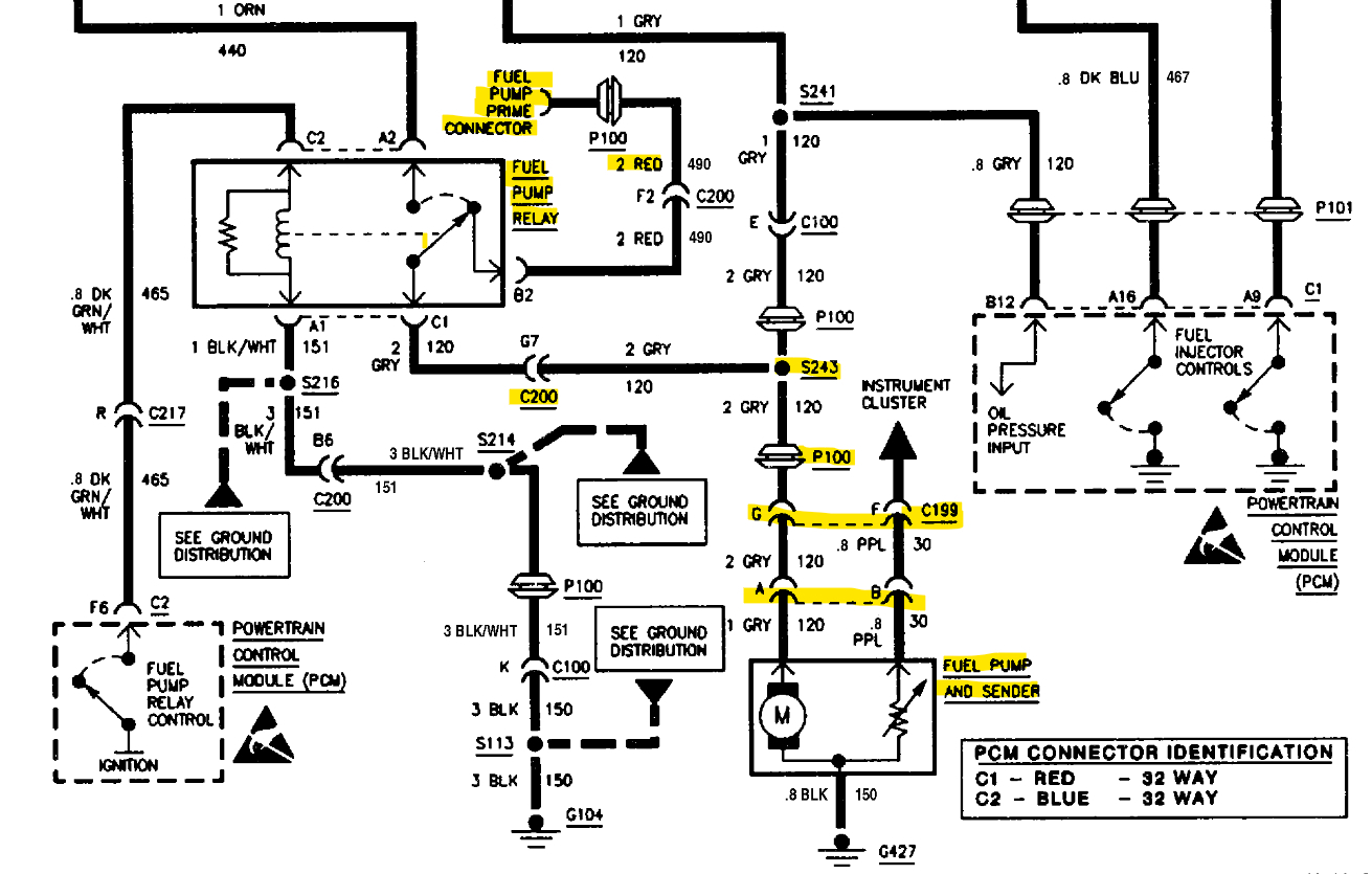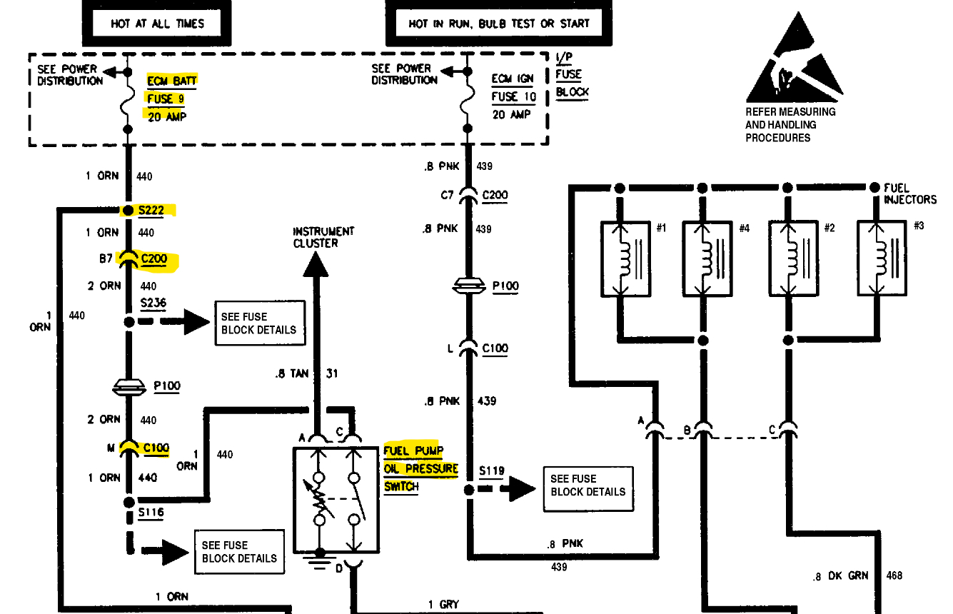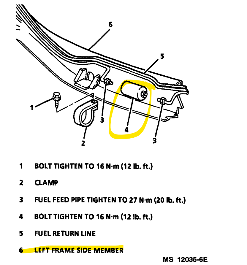 But check the fuel filter first, it looks to be on the frame rail on the driver side, should be about halfway back on the inside of the frame. I would take it off and see if it's clogged first. You can put a bucket under the open fuel line while the filter is off and see if the fuel supply stops or is very little just before the stall out, it sounds like you're losing fuel pressure/volume. If there is no fuel coming out while it's running, then the engine might be starting just from the normal 2 second prime that occurs at key On. Part of the Fuel pump circuit runs through the oil pressure switch as well. I'll post a diagram of the fuel filter. And the fuel pump wiring diagrams.