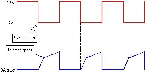 Some Engine Computers can detect some problems caused by injectors by monitoring the current wave forms. This graph shows the voltage and current for one injector. 12 volts is applied to all the injectors, then the control side is pulled to ground by the driver in the computer. That's the red "voltage" graph on top. Current, in the blue graph, ramps up relatively slowly as the electromagnetic field builds around the coil of wire in the injector. When that field gets strong enough, the pintle valve is pulled off its seat to open and let fuel spray in. The point at which that happens is shown by the transition in the "rise time" part of the wave form. That is what the computer looks for. If it doesn't see that transition, it sets a fault code for "injector circuit performance". As far as what I've been taught, Chrysler doesn't monitor that. They just apply the 12 volts and ground to the injector, then the computer assumes the injector responds properly, and it verifies that by watching the oxygen sensor signals.