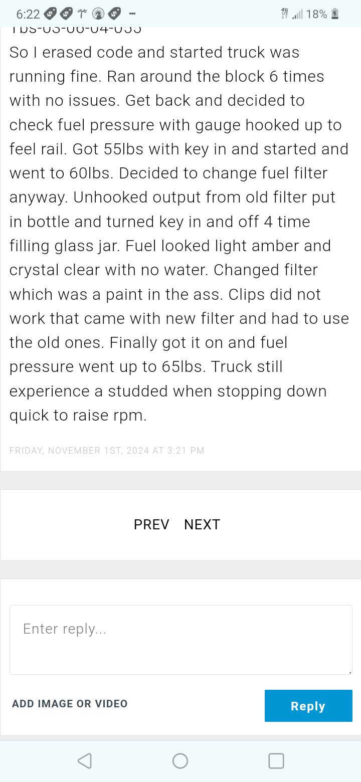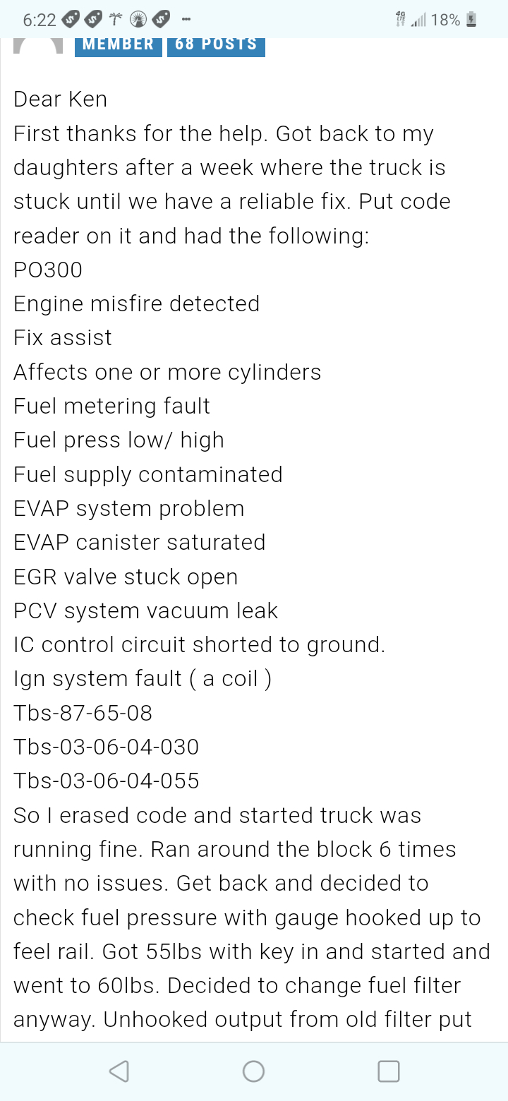 This problem was previously sent and Ken replied. The fuel filter was changed but still has the idle issue. Also performed test with gauge at the fuel rail and a code reader. Code was P0300. See readings and info on the attachments.