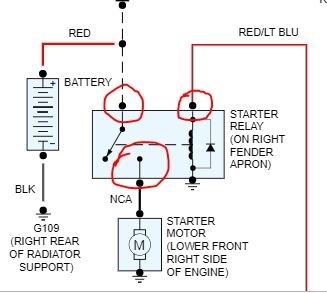 I have attached a picture of the relay on the fender. See picture 1. If the red wire and the red/light blue are switched, you are going to have constant power to the starter.