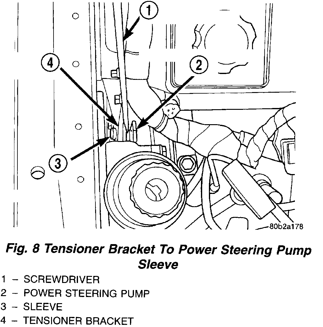 NOTE: The long mounting bolt for the power steering pump is installed in the location where the sleeve is in the tensioner bracket.