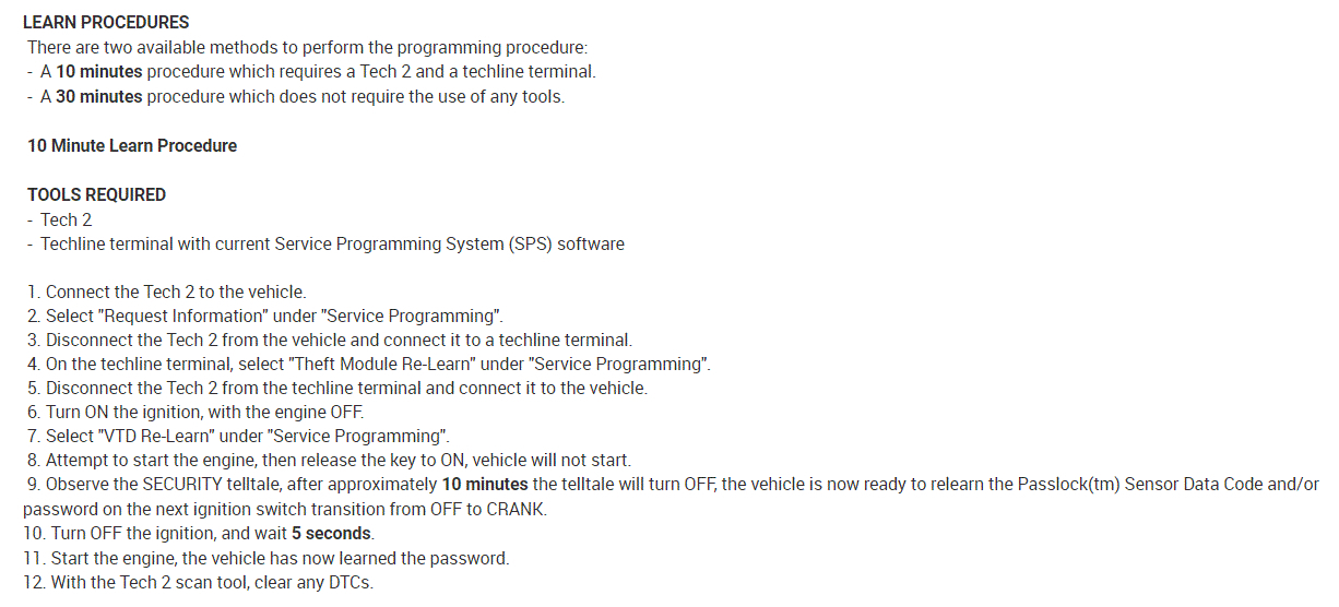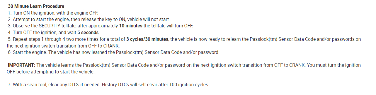Now, there are two ways to reprogram this. One requires a scan tool capable of communicating with the system and 10 minutes, and the other one doesn't require a scanner but requires 30 minutes to do.
