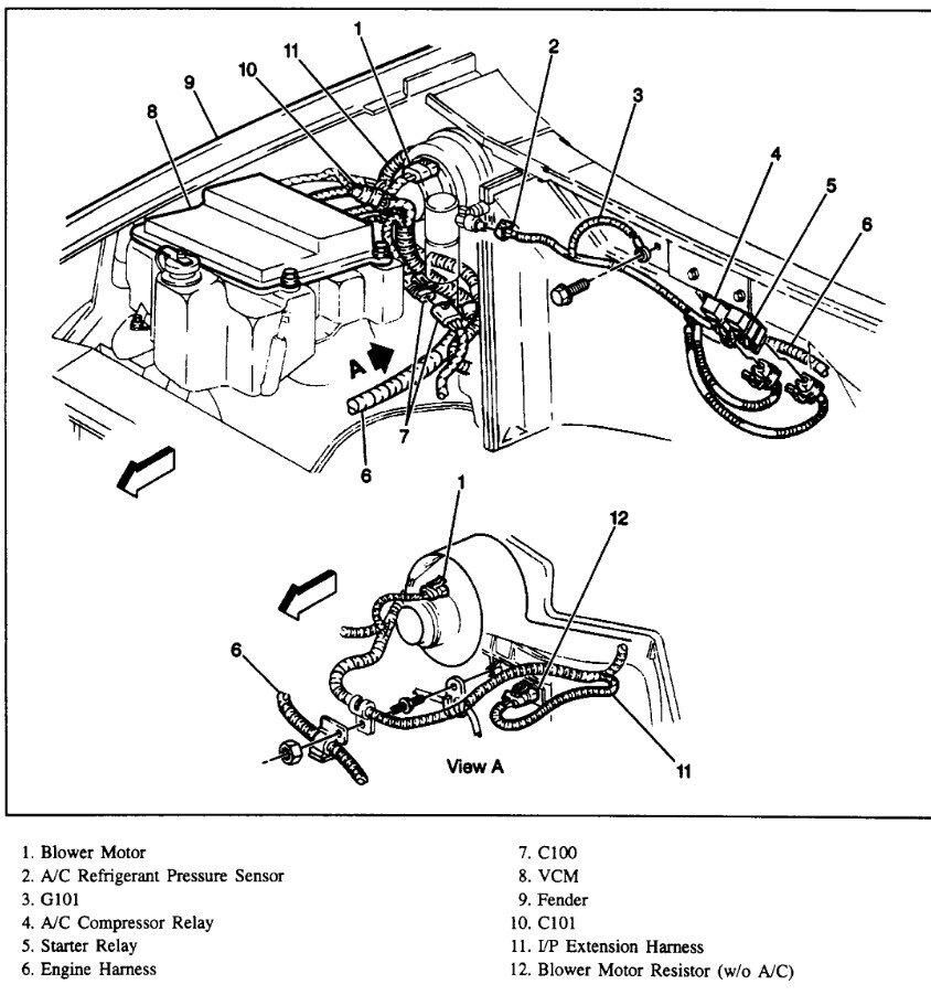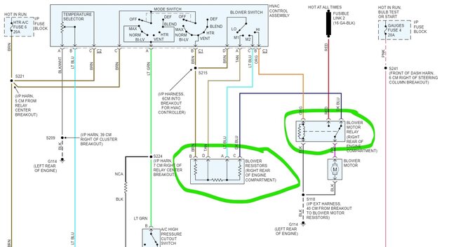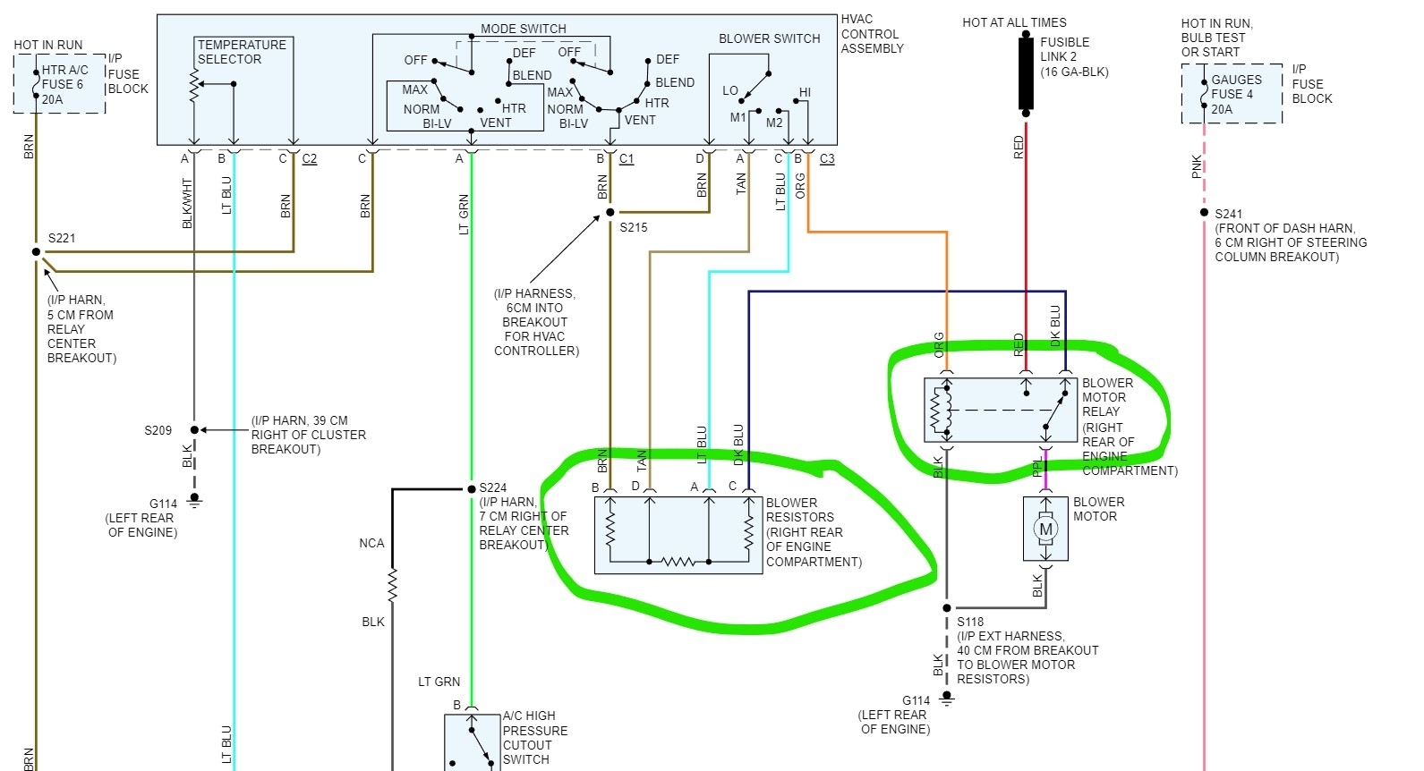 If you have no blower activity on any speed including high, I would suspect the blower motor itself or the common issue which is a bad ground to the blower. I would start at the blower motor connector. Unplug it and connect a test light to ground and to pin A purple wire on the connector. Now select the different speeds. Does the light come on and change brightness? If yes, then check the black wire in the connector for a ground. GMs of that vintage had an issue with the ground connection at the back of the engine corroding off.