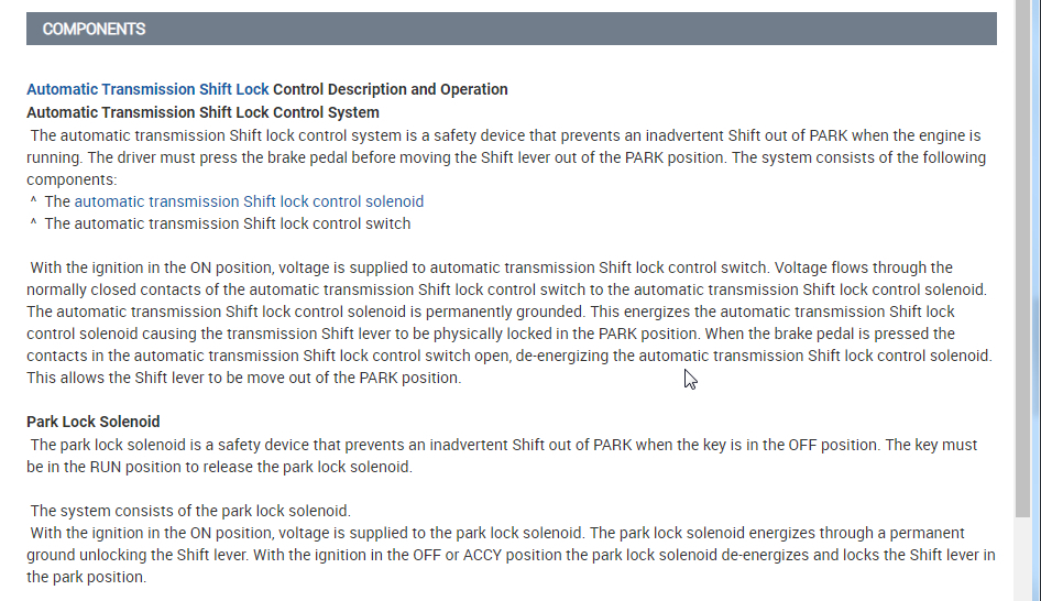 I have the vehicle listed above XL model. Someone tried to steal it and messed up the ignition. So I changed out the whole ignition. Lock cylinder, lock switch, the housing all the wires whole thing. Anyways long story short car sat for a couple weeks battery drained. Had to do a relearn with the new key due to theft deterrent system. Got all that fixed security light is still on but the car starts and runs. Only problem now is car won't come out of Park. Please help.