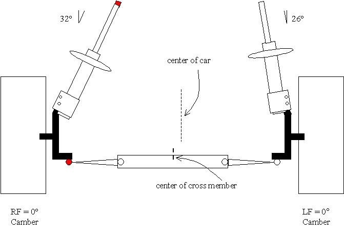 You will take the car in for an alignment, and the mechanic will see the unequal camber on the two sides and want to correct that. While that will make the numbers look good on the computer, it does not address a more pressing underlying problem. Moving the cross member to one side moved the lower attaching points of the front struts. The upper mounts did not move, so the angle of the struts changed. One is standing up straighter and one is leaning more. That angle is called "steering axis inclination", SAI. If that is overlooked and just camber is set to specs, you will have the most miserable-handling car you ever experienced. With every tiny bump in the road, the car will dart unexpectedly in various directions. You will become worn out just driving it to the shop.