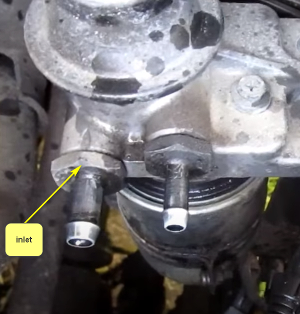 To check if the electric pre supply pump is defective you can check the fuel flow at the fuel filter inlet, see image 2 below.
