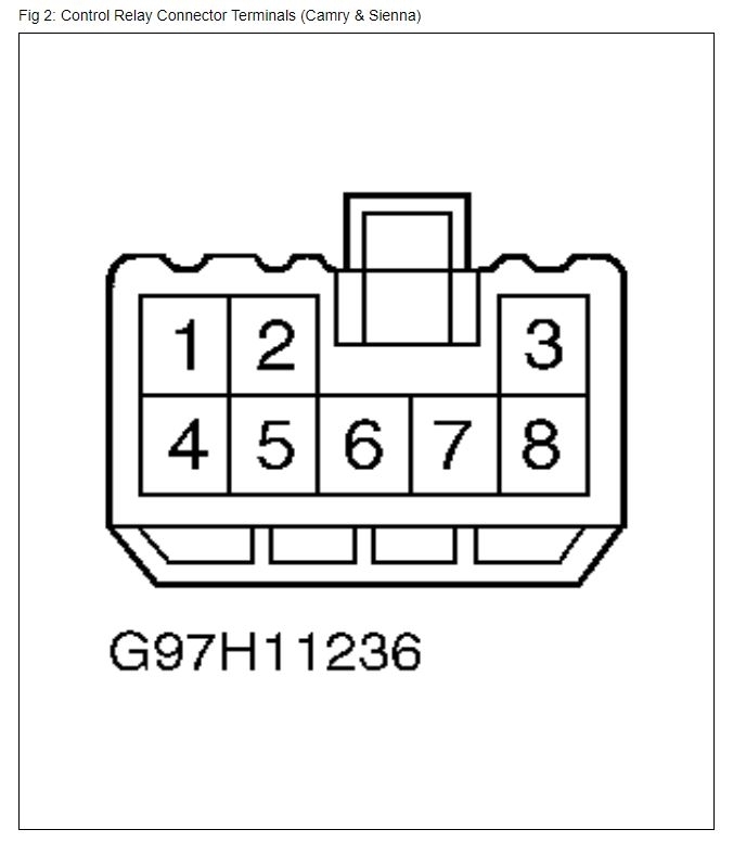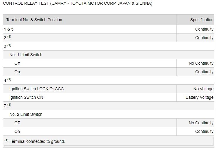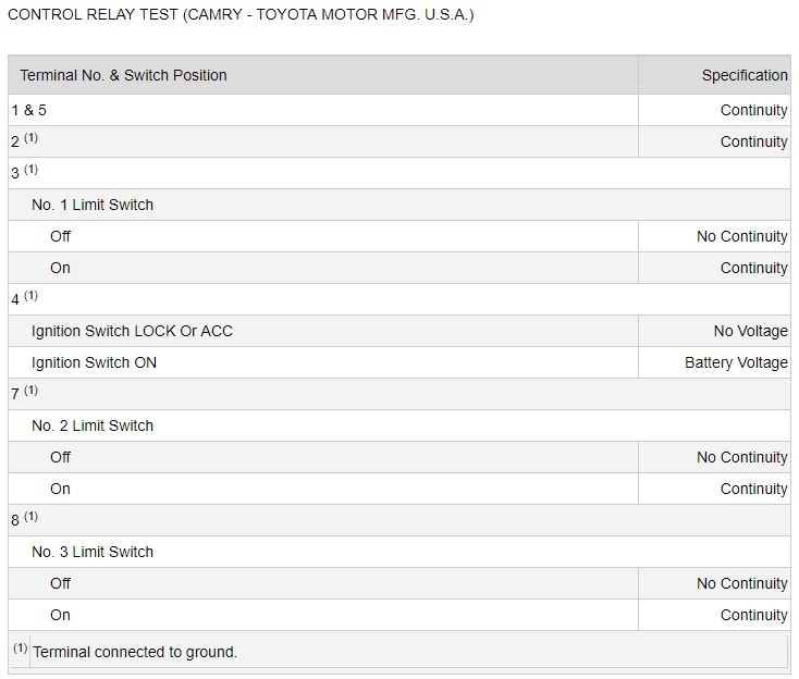 Check for continuity or voltage as indicated at control relay wiring harness connector terminals with sunroof switch or limit switch in specified positions. See appropriate Control relay test table. If test results are as specified, control relay circuits are okay. Replace control relay. If test results are not as specified, repair or replace appropriate switch or wire. See Fig 1 or Fig 2.