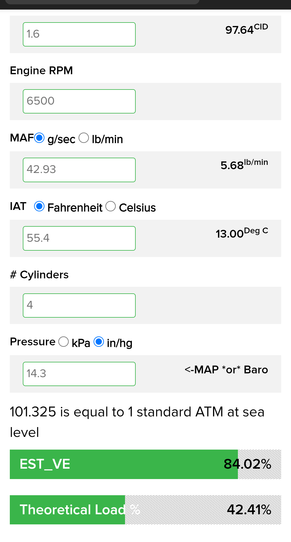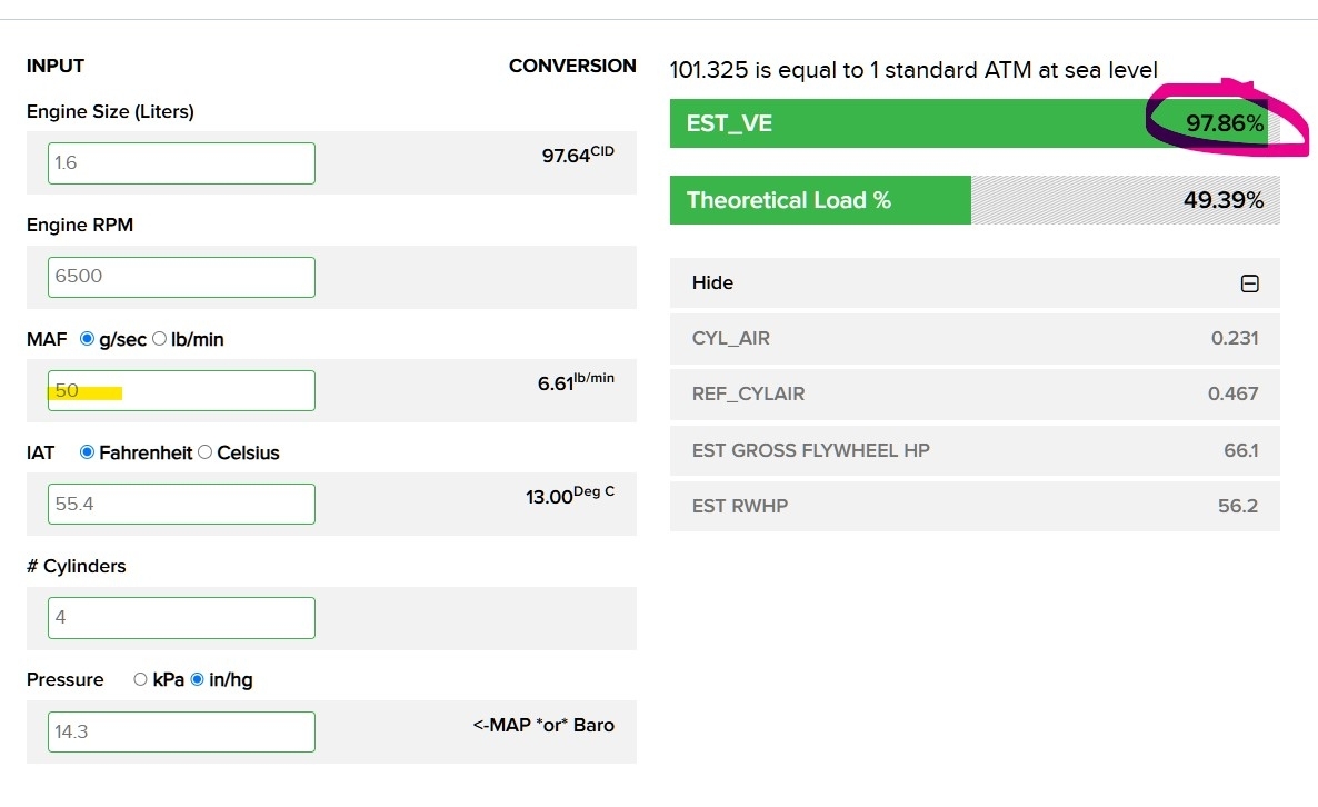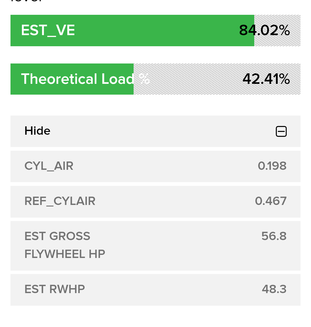 Being at almost 84% VE, I don't think it would be a cat, but if you want to double check that, you can do a back pressure test at the front 02 location. You shouldn't be over 1.5psi at idle, I use an old 02 threaded section with an adapter for my vacuum gauge, you don't need to keep it on there long, just long enough to get a reading. I have seen people melt their vacuum gauges with just leaving it on the exhaust. Most restricted exhausts will show a much higher number right away and its almost something you can hear on these smaller engines; with that sort of hiss they make when the exhaust is just pushing out any place it can. Let us know what you find.