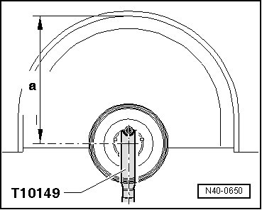 The bolted connections of the shock absorber to the wheel bearing housing must only be fastened when the dimension "a" is achieved! Refer to => [ Tightening of the respective bolts/nuts must then only occur after dimension between the wheel hub center and the lower edge of wheel housing has been attained. ] See: Suspension > Components > Rear Axle, Lifting to Curb Weight Position.
