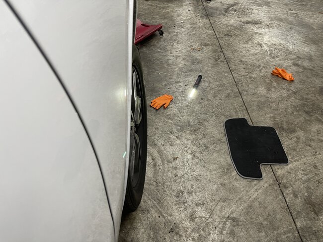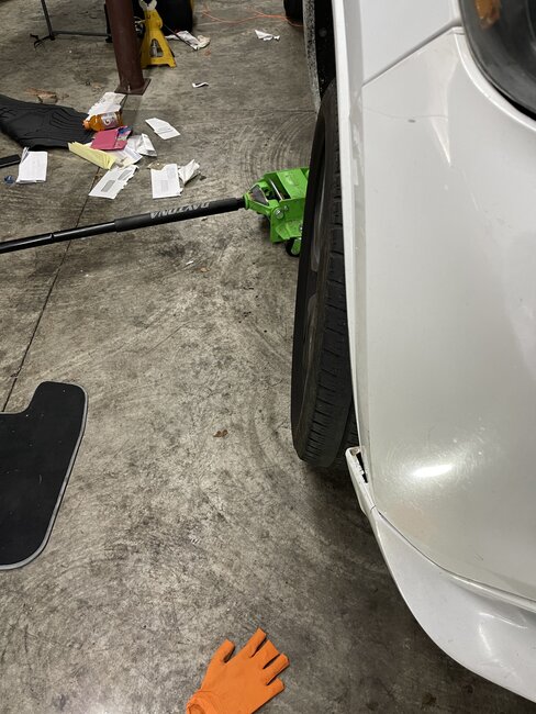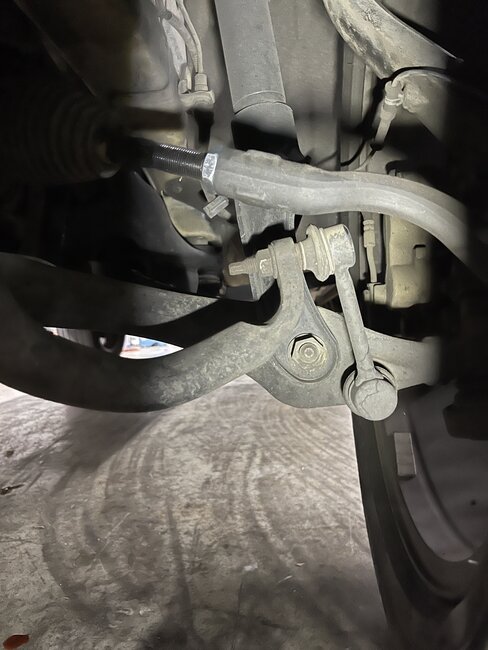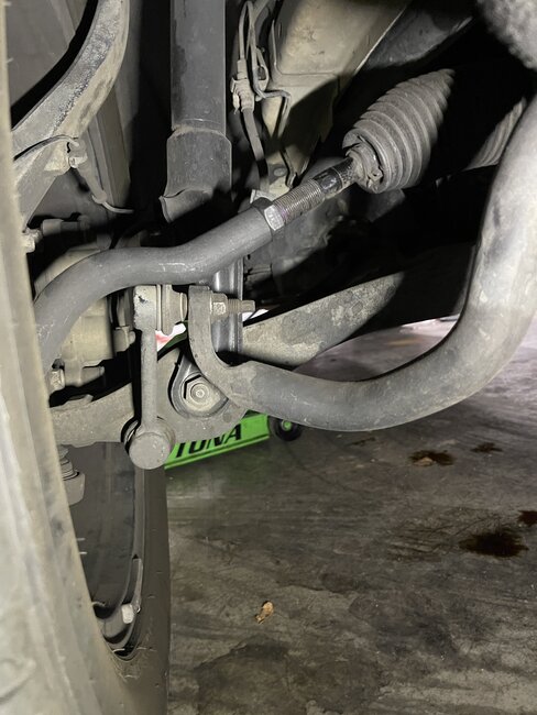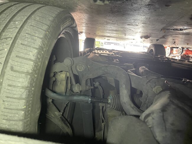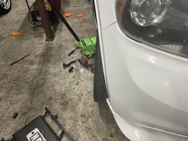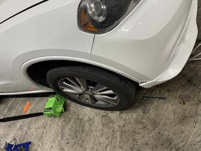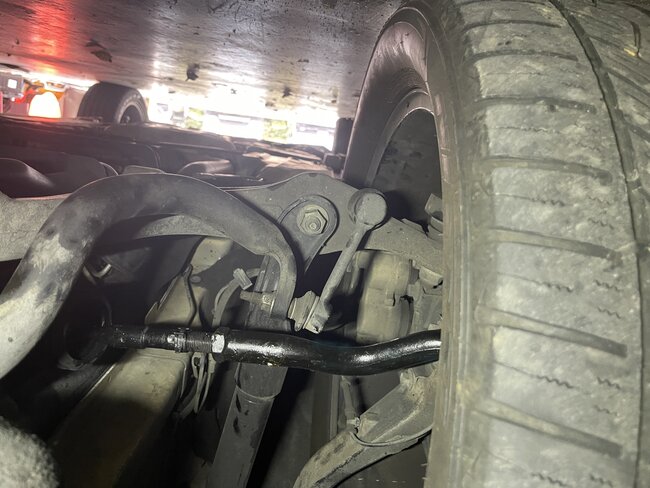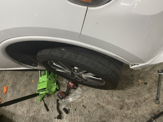 While the repo truck was Repossessing this car, the owner came down the road in another car and tried to stop the repo and bumped into the passenger tire going around 40-50 MPH. We got the car and now steering is off center. You can see how the wheel is out on bottom while upper is in. I cannot tell what could have bent. Tow truck guy told me it may have bent the tie rod. Do you see anything different? I included pictures to compare it to driver side. Looks like the Driver side has a new outer tie rod. You can see how driver side is straight while passenger is bent.