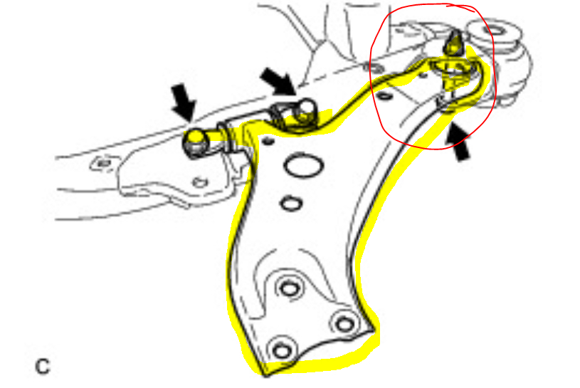 There is a lower control arm. I attached a picture of it below. When you check it, pay special attention to where I circled. The retainer bolt is installed vertically through the bushing. If they fail, that is the most common place.