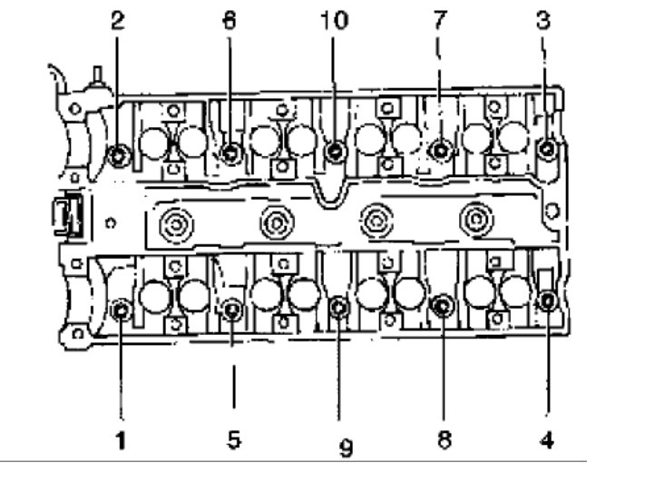 Tighten the cylinder head bolts gradually and in the sequence shown. Tighten: Tighten the cylinder head bolts to 25 Nm (18 ft. Lbs.) And turn the bolts another 3 turns of 90° using the angular torque gauge KM-470-B.