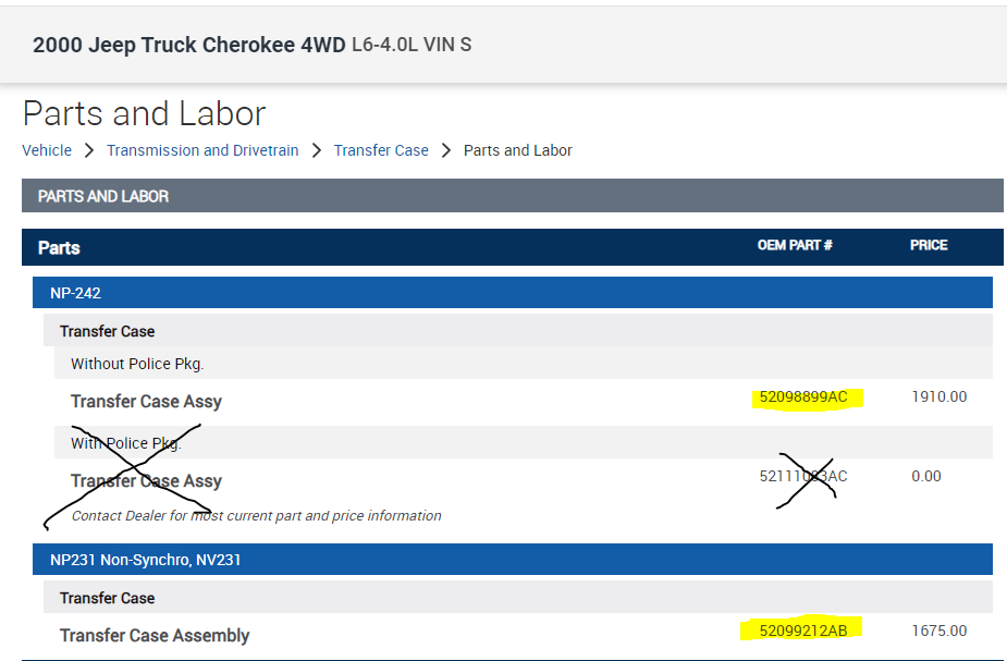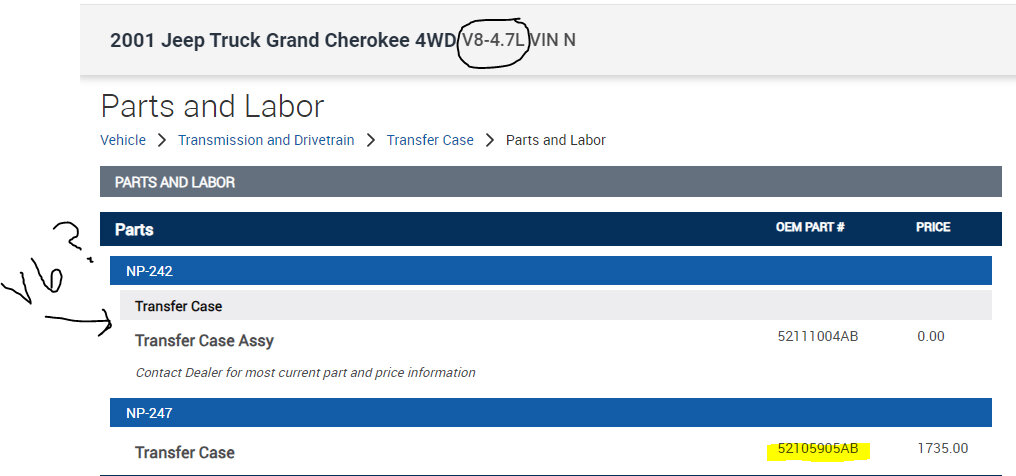 Okay, I have a question. I am thinking about buying the vehicle listed above Classic Sport Utility four-door. The guy says the transfer case is out and I was wondering if a transfer case from a 2001 Jeep Grand Cherokee Laredo all-wheel drive V8 would be the same and if it would work? I don't know the transfer case model numbers or what the numbers are on it it would be nice to know that I know but I have no access to them right now. But I didn't know if you knew right off hand if they would swap out or not let me know thanks for your time.