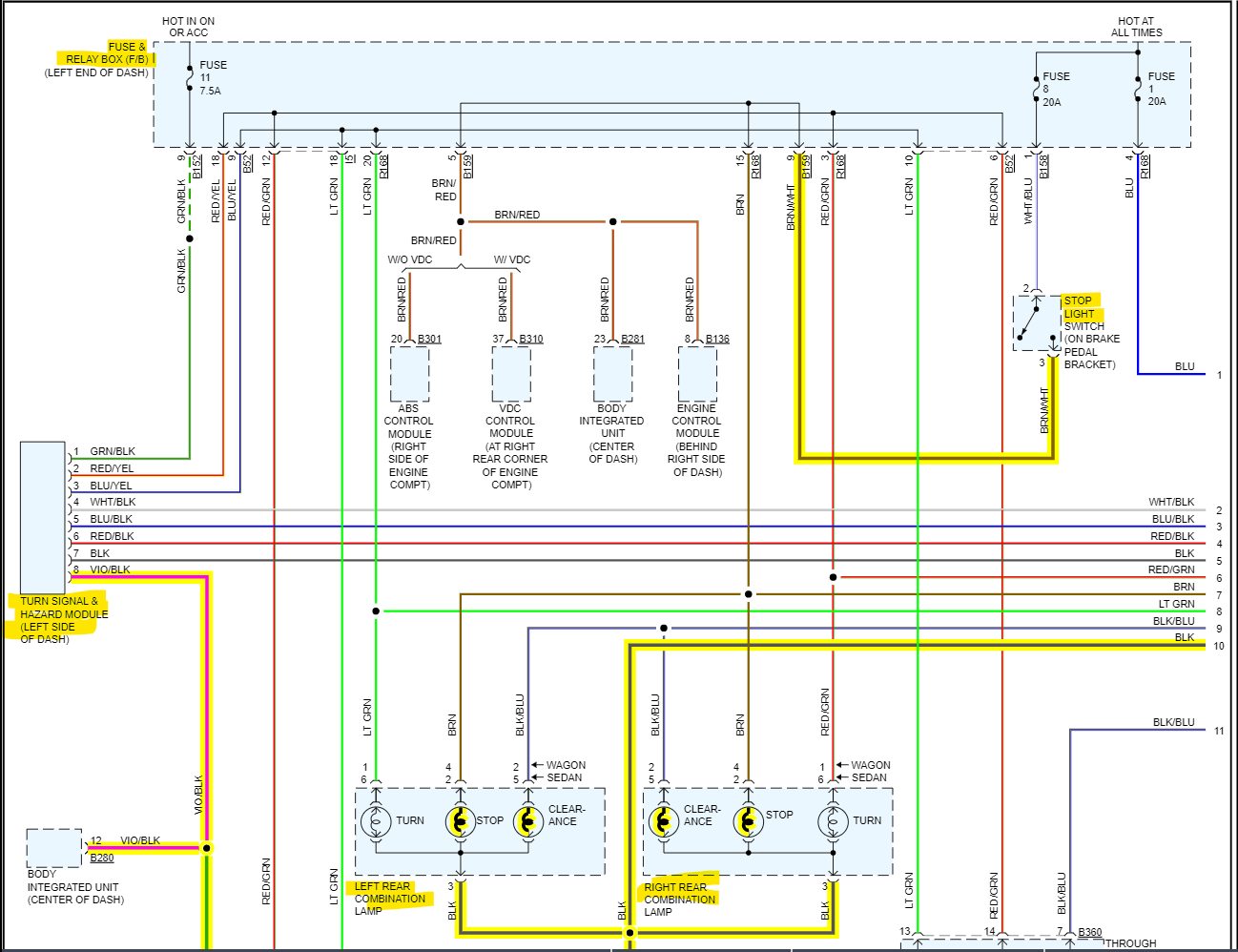 When you used the Fluke meter to test the sockets did you have 12volts there? Also, 12volts with the Brake pedal depressed? To be honest with you, I'm going through the aftermarket wiring diagrams as well as the OEM Subaru diagrams, and I'm not sure either are correct. I used to actually work for Subaru and owned a 2005 Legacy, it was a great car. But these diagrams are showing the rear lamp assembly with turn, stop, and clearance lamps in each rear lighting assembly. So, 3 bulbs in each side, then there are turn signal LEDs in each side mirror, then the license plate lamps, but then just the Front turn signal lamps, I'm not seeing any upper lamps that you're mentioning. Can you take a picture for me and post it here? I even changed to an 06' and still the same. Does your vehicle have 2 sets of brake lamps on each side, one on top of the other?