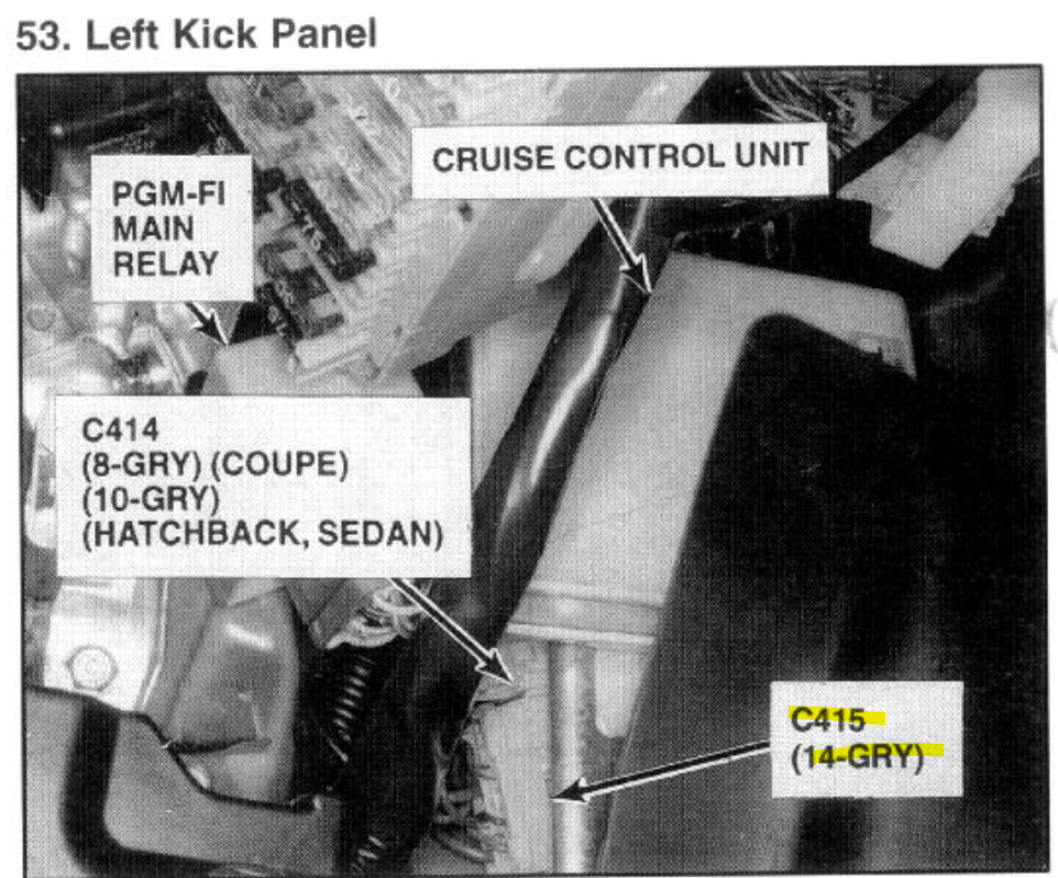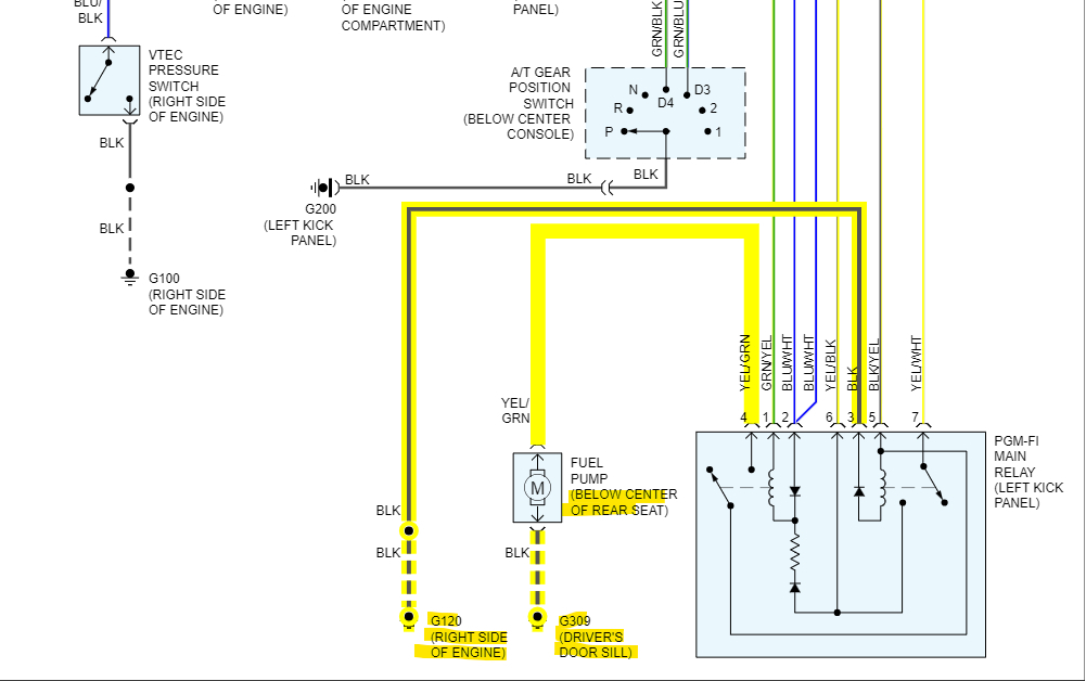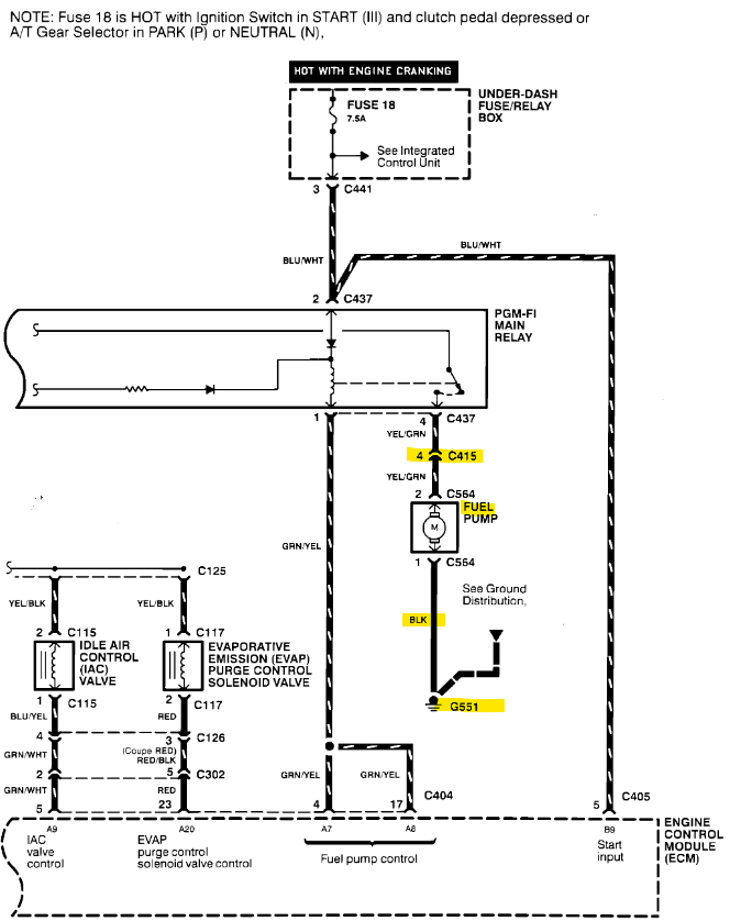 You can try running another temporary ground wire from the pump's ground (black wire) by back probing the fuel pump connector, so you're adding another ground to it, and if the pump starts right away, you'll know it's a grounding issue right at the pump, or if it has something to do with the wiring to or from the PGM FI relay. There is 1 connector between the relay and the pump C415. I will look for its location.