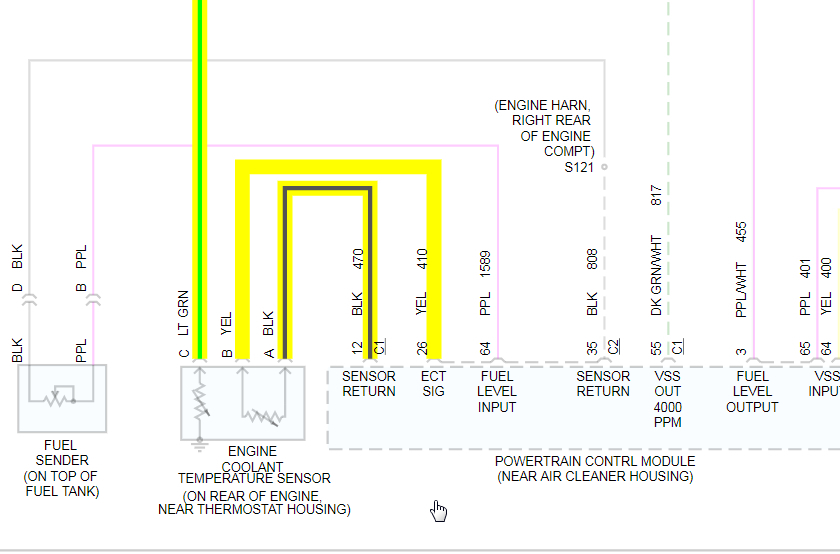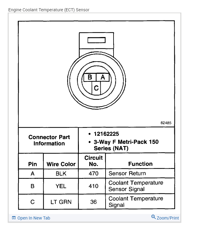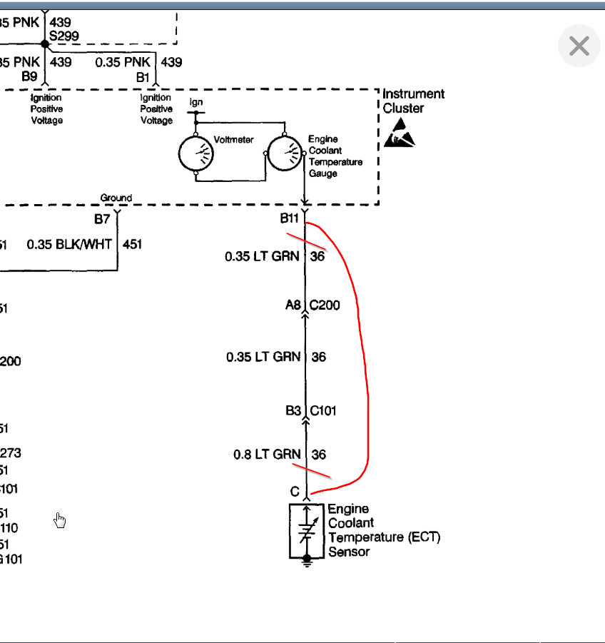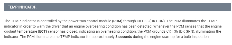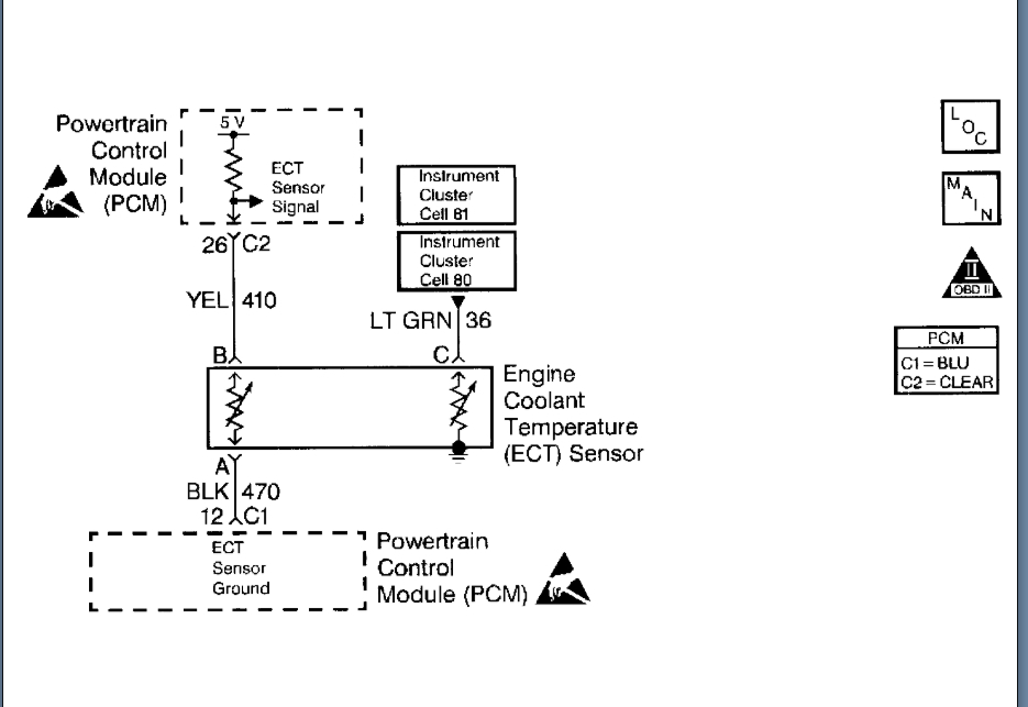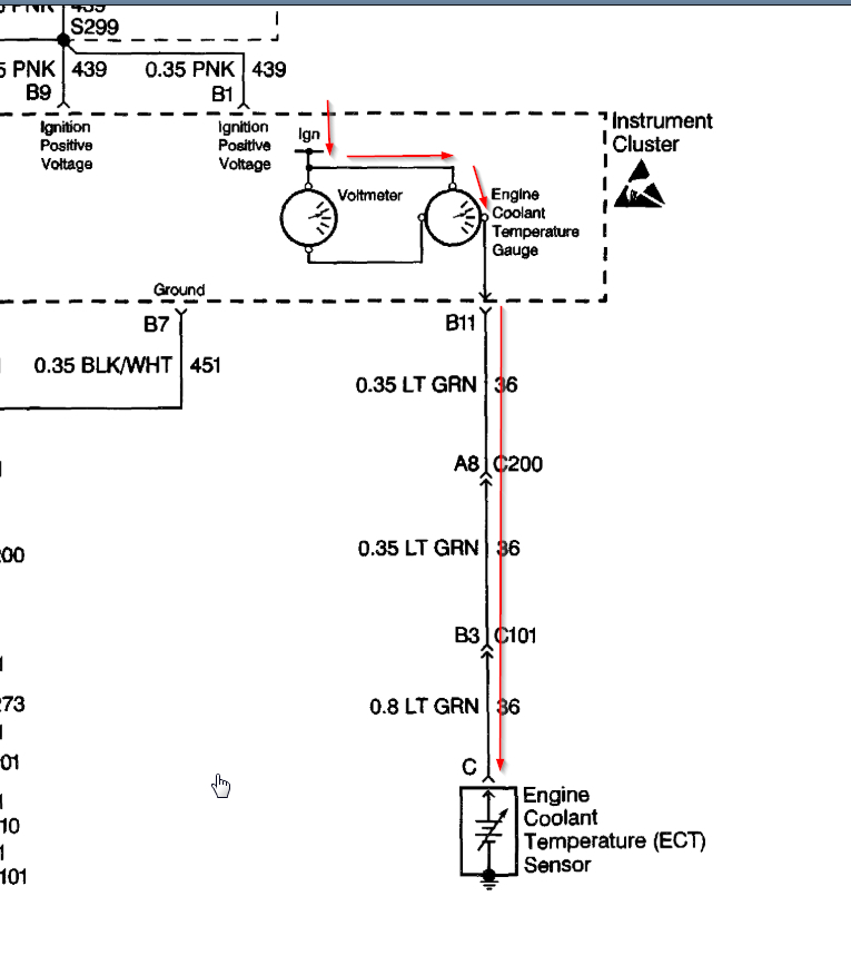 The way this works is the cluster is supplied 12 volts through the PCM fuse. However, the ground for the coolant temperature gauge is past the sensor. This means between the 12 volt source and ground is a resistor. Based on the temperature of the coolant the resistor varies its resistance which will increase or decrease the voltage that the gauge is reading.