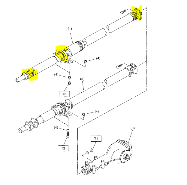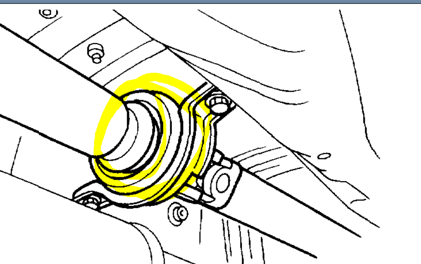 Also, the idea that it only does it in 4th gear is odd. It could even be a failing universal joint or center bearing. In pic 1 below, I highlighted the center bearing and both universal joints. You can inspect those for evidence of wear. Also, pic 2 shows the carrier bearing. That can certainly cause what you described.