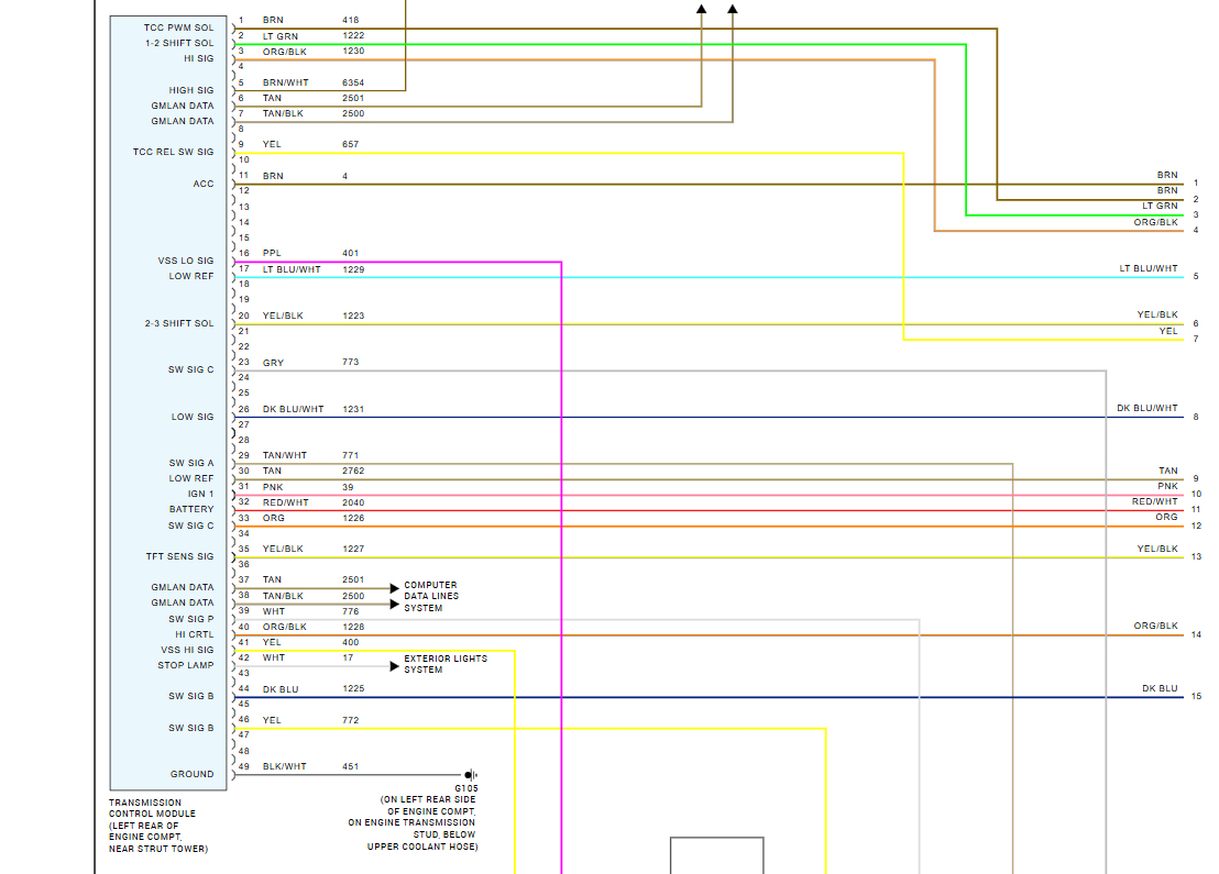I need the right an a right colored diagram for the wiring of a TCM wiring harness of the correct spits a colors of where the right colored pin out wires go through out to? Please!