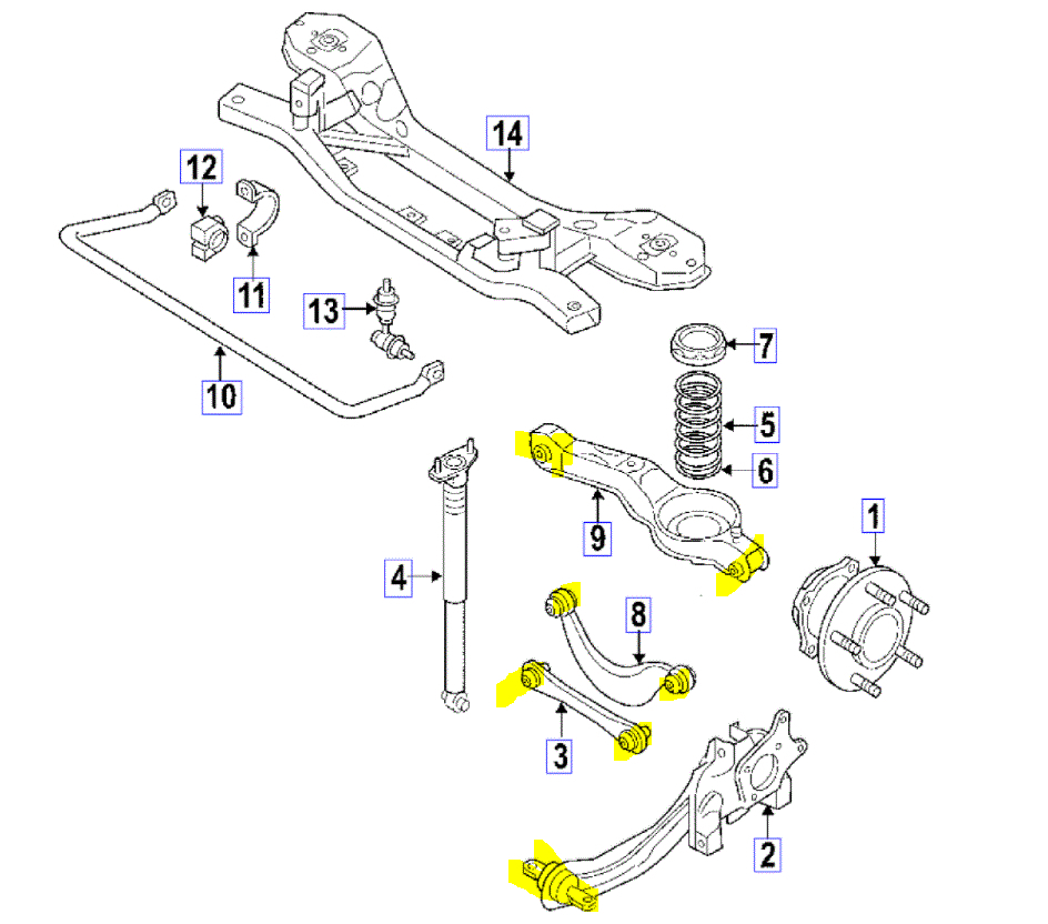 I attached an exploded view of the rear suspension below. I highlighted several bushings that can cause excessive play. Take a pry bar and see if there is movement in the highlighted bushings. Also, worn shocks can cause the rear to feel like it's doing this as well if they are bad enough. Bounce the rear of the vehicle and see how long it takes for it to stop bouncing.