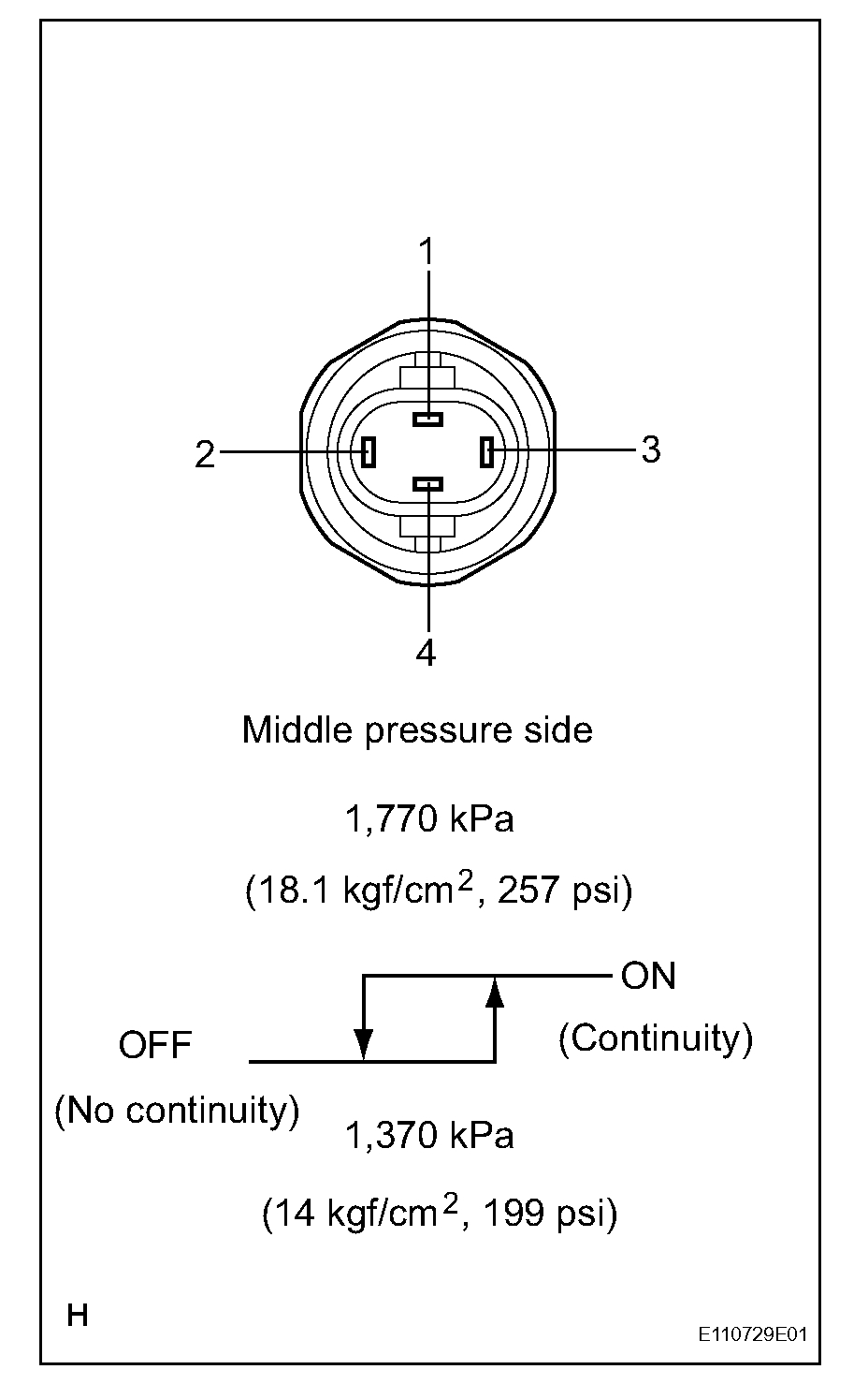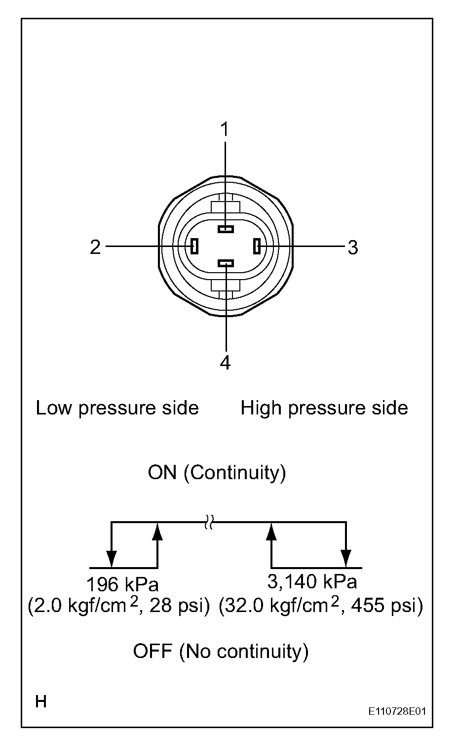3. Check continuity between the terminals when refrigerant pressure is changed, as shown in the illustration.