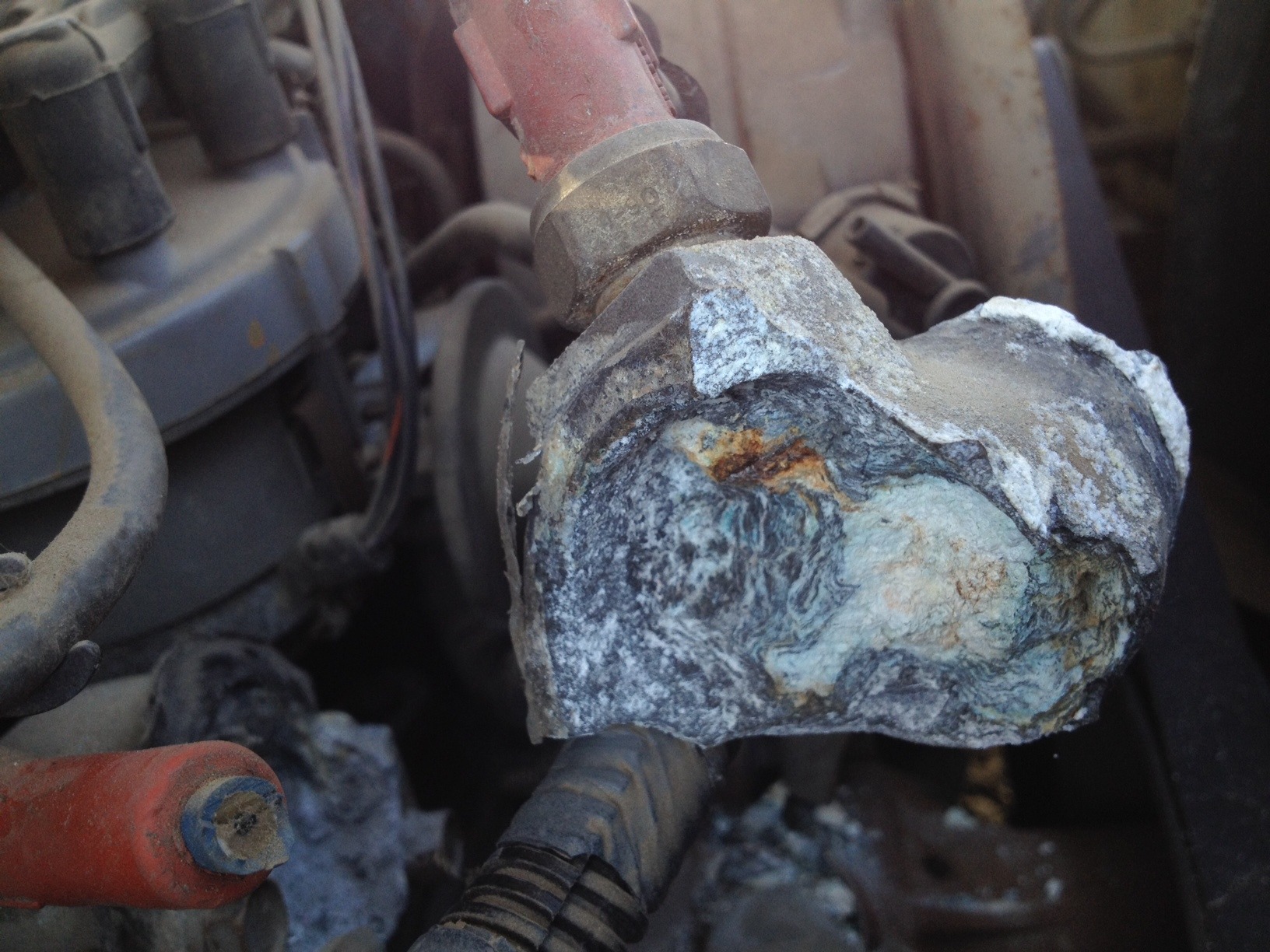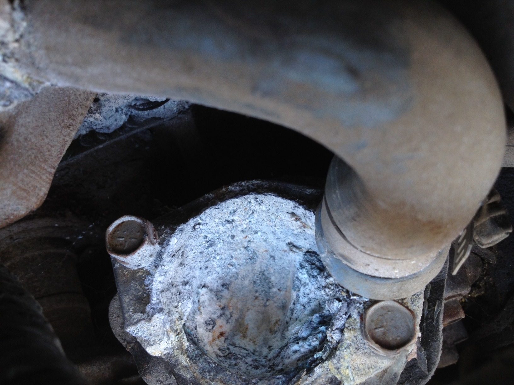 I did start the car with fuel added to the carb; of course the in-line filter added near the tank that I installed circa 1999 is probably gummed up; added 3 gallons to the tank. Fuel pump never got supplied. Then I noticed this! But point being that the water pump was also run under these powdery conditions. And look -- the thermostat has completely disappeared and FOSSILIZED.
