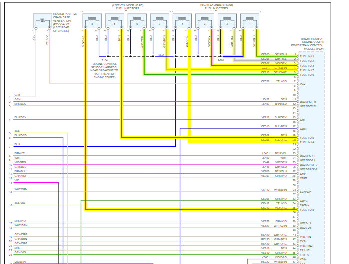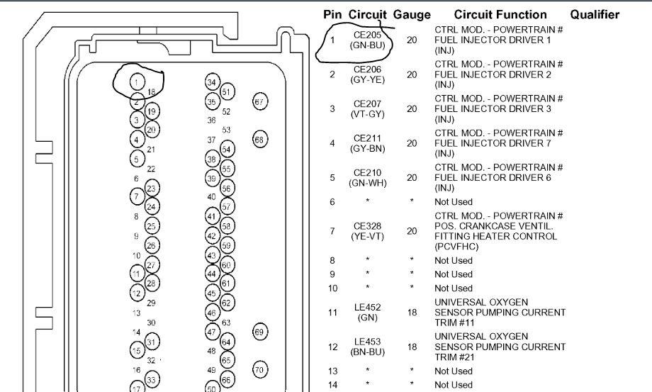 3) When Key is in ON position, I measure DC around 3.4V on the PCM wire and 12Volts on the common wire of all fuel injectors.