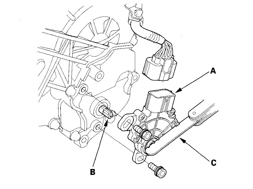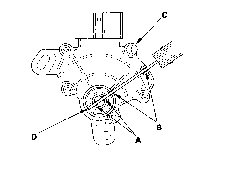 7. Align the cutouts (A) on the rotary-frame with the neutral positioning cutouts (B) on the transmission range switch (C), then put a 2.0 mm (0.08 inch) feeler gauge blade (D) in the cutouts to hold the switch in the N position.