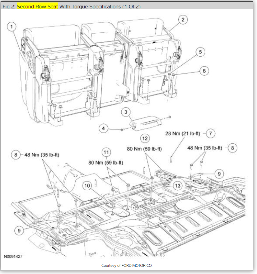 1. Install the third row seat and the 4 mounting bracket-to-floor bolts.