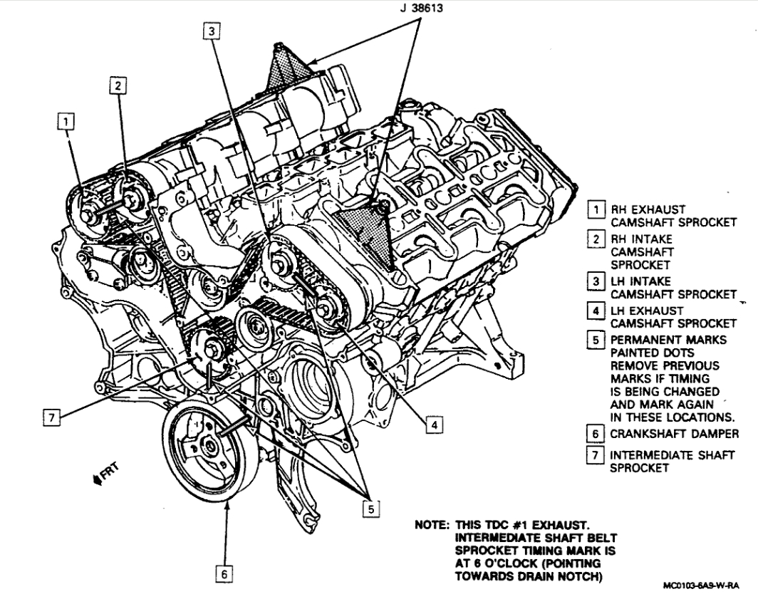 6. Remove J38613-A timing clamp from left front bank, and rotate cam sprockets so that the timing marks are opposite of each other. Use a straight edge to verify that the timing marks are opposite of each other.