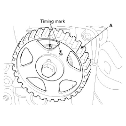 10. Turn the crankshaft pulley, and align its groove with timing mark "T" of the timing belt cover. Check that the timing mark of camshaft sprocket(A) is aligned with the timing mark of cylinder head cover. (No.1 cylinder compression TDC position)