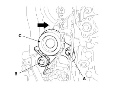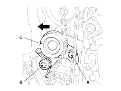 13. Move the tensioner pulley(C) in the direction of the arrow shown after loosen the mounting bolt (A, B).
