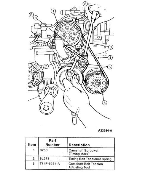 CAUTION: If you attempt to remove timing belt or adjust tension without loosening both timing belt tensioner adjusting bolt and spring pivot bolt, you will break Camshaft Belt Tension Adjusting Tool T74P-6254-A when you attempt to relieve tension on belt.