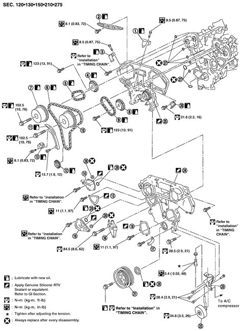 When installing camshafts, chain tensioners, oil seals, or other sliding parts, lubricate contacting surfaces with new engine oil.