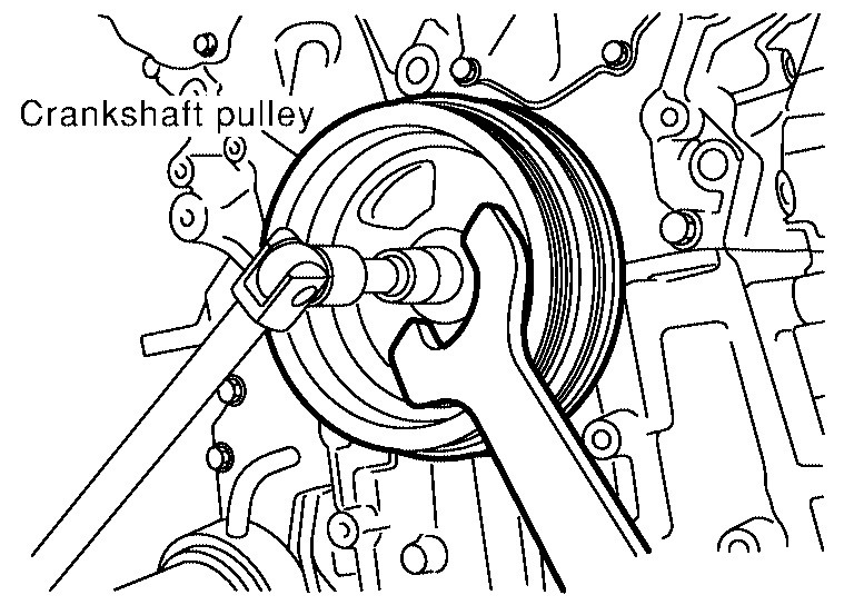 a. Loosen crankshaft pulley mounting bolt using pulley holder and locate bolt seating surface at 10 mm (0.39 in) from its original position.