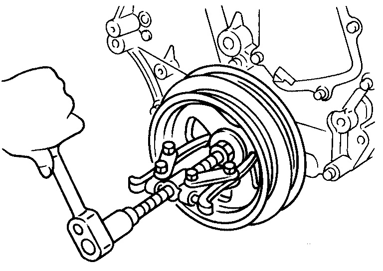 b. Position a pulley puller at recess hole of crankshaft pulley to remove crankshaft pulley.