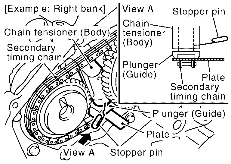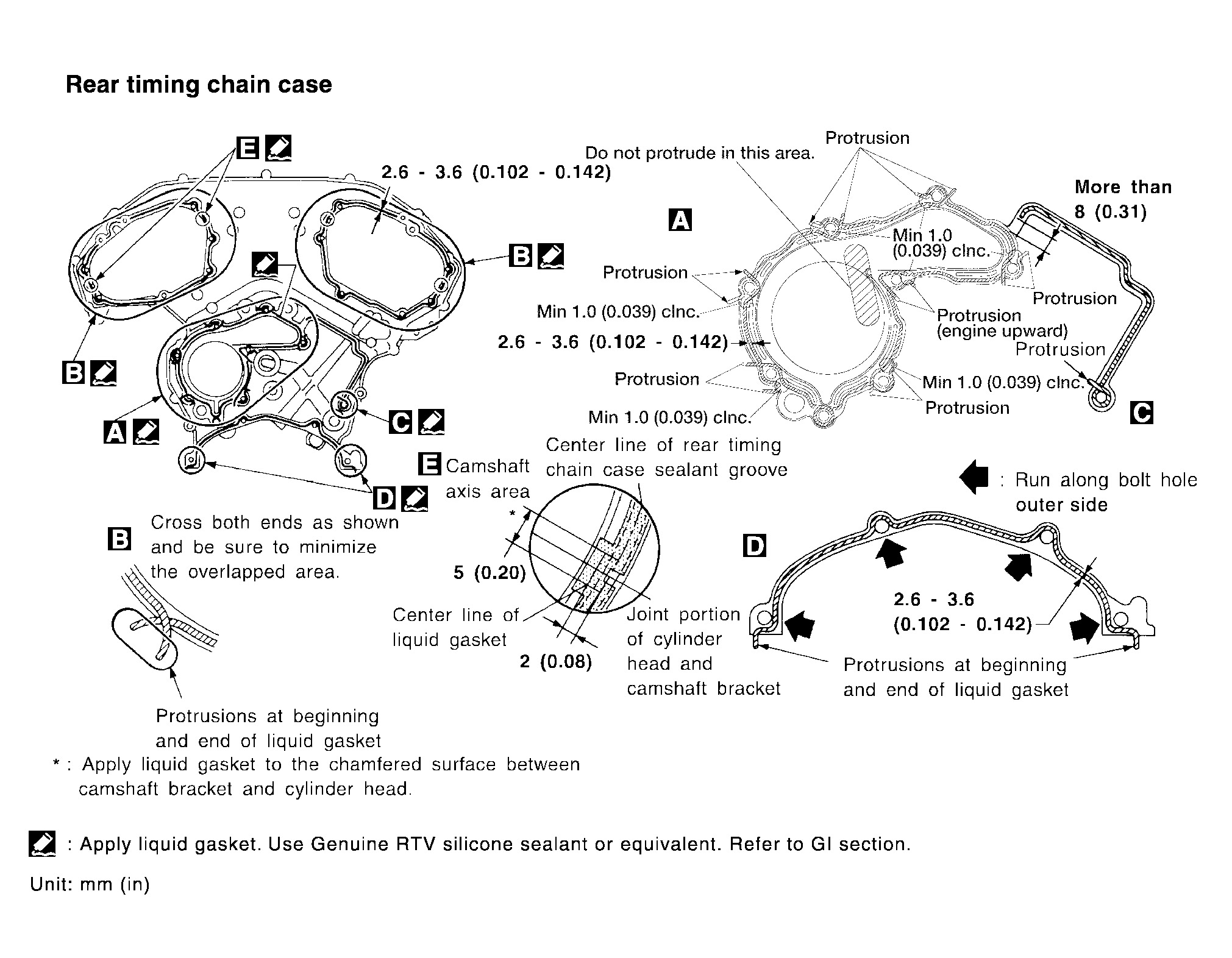 This section describes procedures for removal/installation procedure of the front timing chain case and timing chain related parts, and rear timing chain case, when oil pan (upper) needs to be removed/installed for engine overhaul, etc. If removing rear timing chain case, remove the engine assembly.