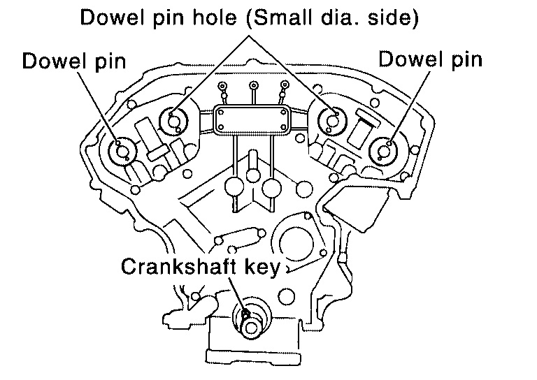 Install dowel pin on the rear timing chain case into dowel pin hole in front timing chain case.