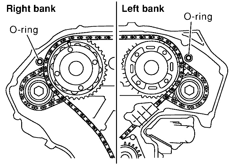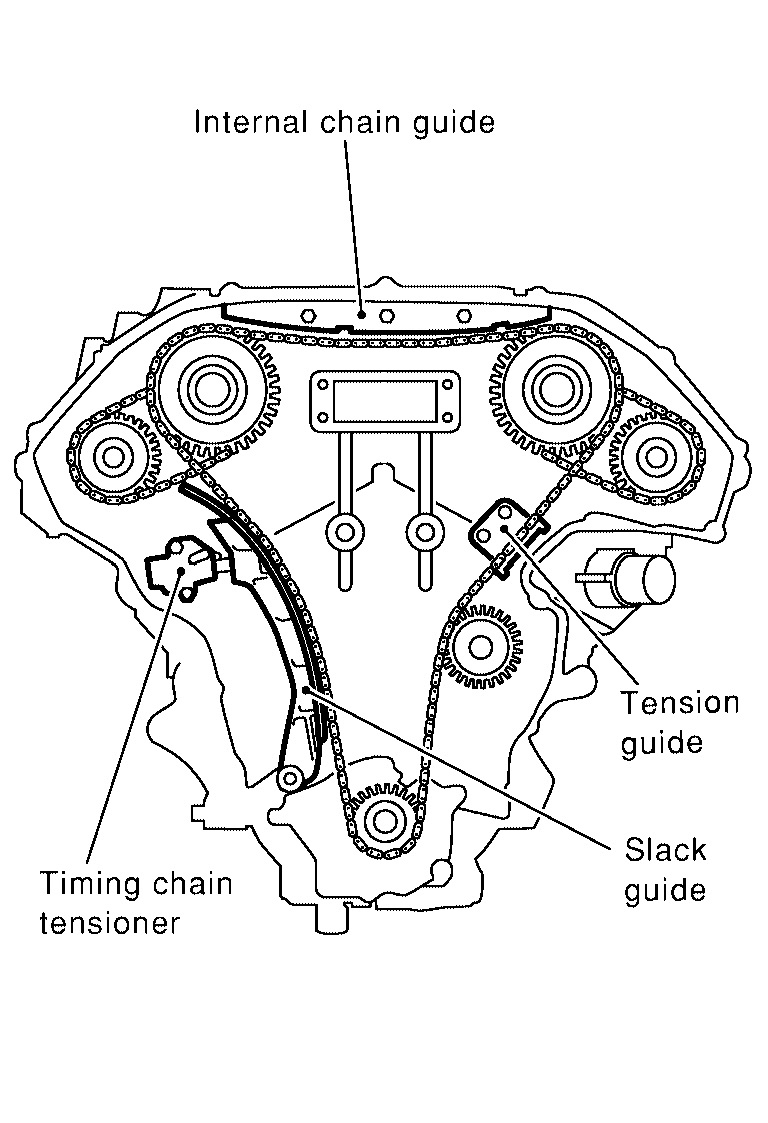 After removing timing chain, do not turn the crankshaft and camshaft separately, or the valves will strike the pistons.