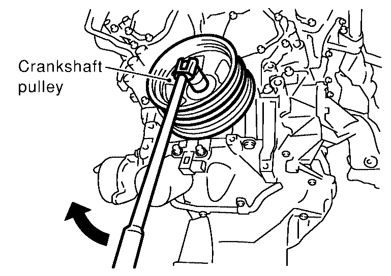 a. Rotate crankshaft pulley clockwise to align pointer (A) with TDC mark on crankshaft pulley.