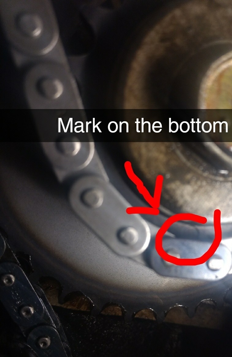 Because I got a new timing chain kit from advance Auto but every time the top meets its mark the bottom does not as you can see in the picture.