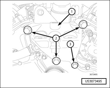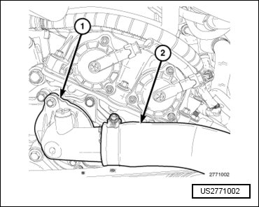 - If required, remove the remaining four M6 bolts (2) and the coolant outlet housing (1) from the engine timing cover.
