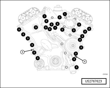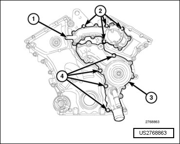 - If removed, install the water pump (3) to the timing cover using only the four bolts (4) shown. Refer to => [ Water Pump ] See: Water Pump > Removal and Replacement > Water Pump.