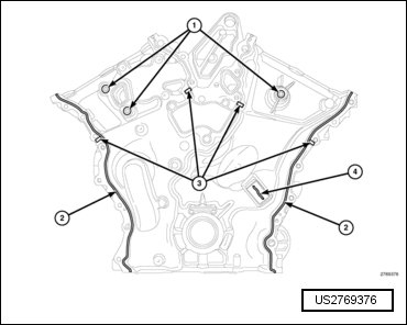- Apply a 2 to 3 mm wide bead of Volkswagen genuine Engine RTV Sealant to the front cover as shown in the following locations: