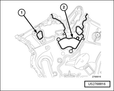 - Install the coolant outlet housing gasket (1) and the water pump gasket (2).