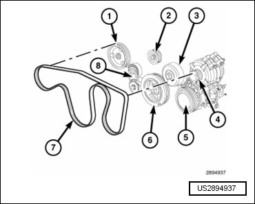 - Install the accessory drive belt (4). Refer to => [ Accessory Drive Belt ] See: Drive Belt > Removal and Replacement > Accessory Drive Belt.