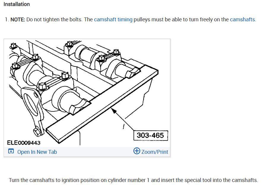 This engine does not have marks like you would think, they use a bar type tool which holds the camshafts from the rear of the engine, I think the auto parts store will have this they can rent to you for free. Here are the marks for the crankshaft though and how to install the timing rig. Check out the images (below). Let us know if you need anything else.
