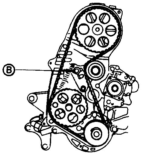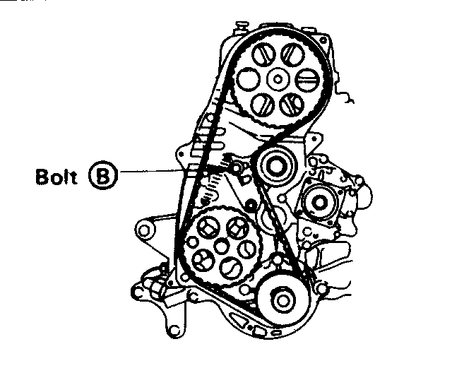 2. Loosen bolt "B", and draw the tension pulley fully to the water pump side and temporarily tighten bolt "B".