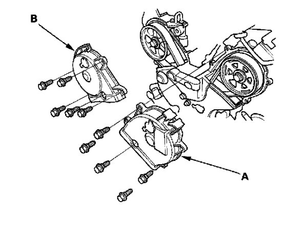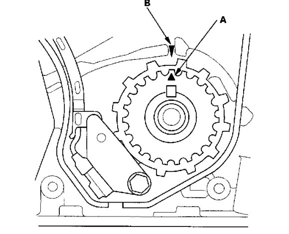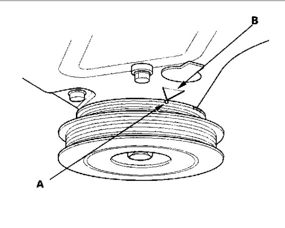 18. Turn the crankshaft pulley so its white mark A lines up with the pointer B.